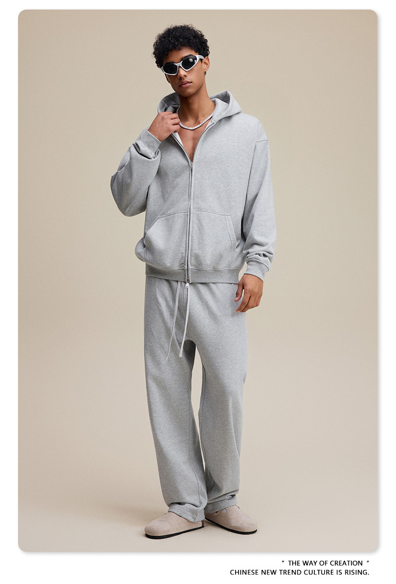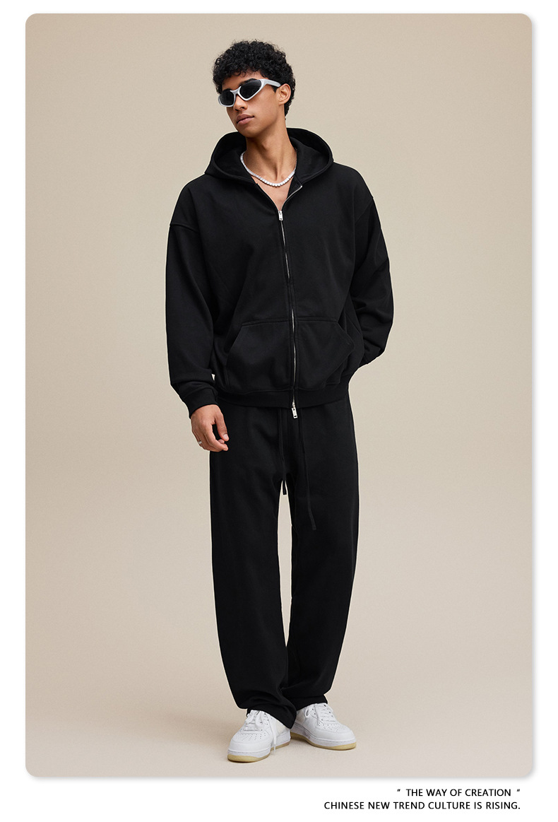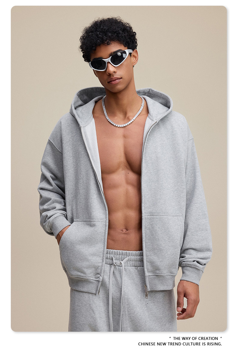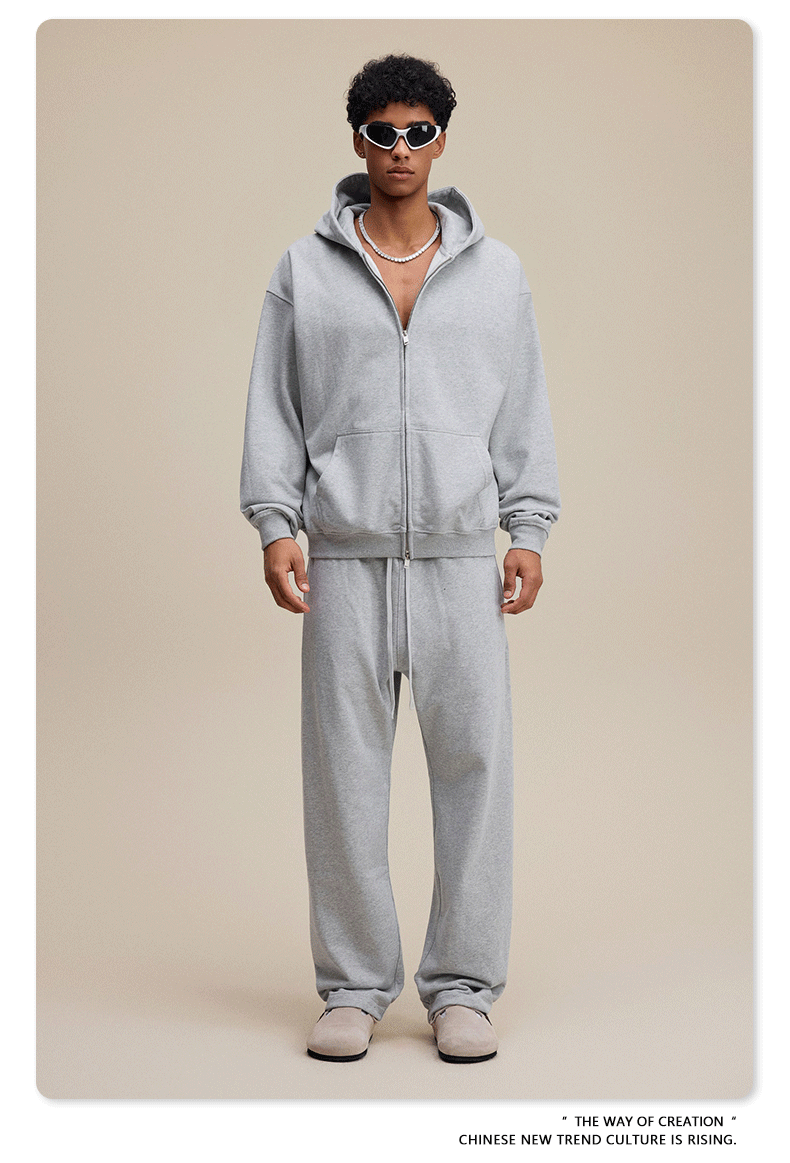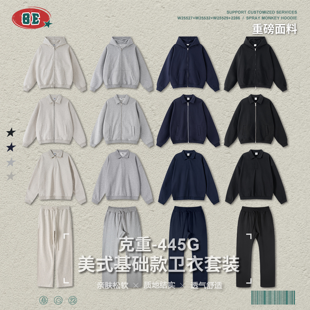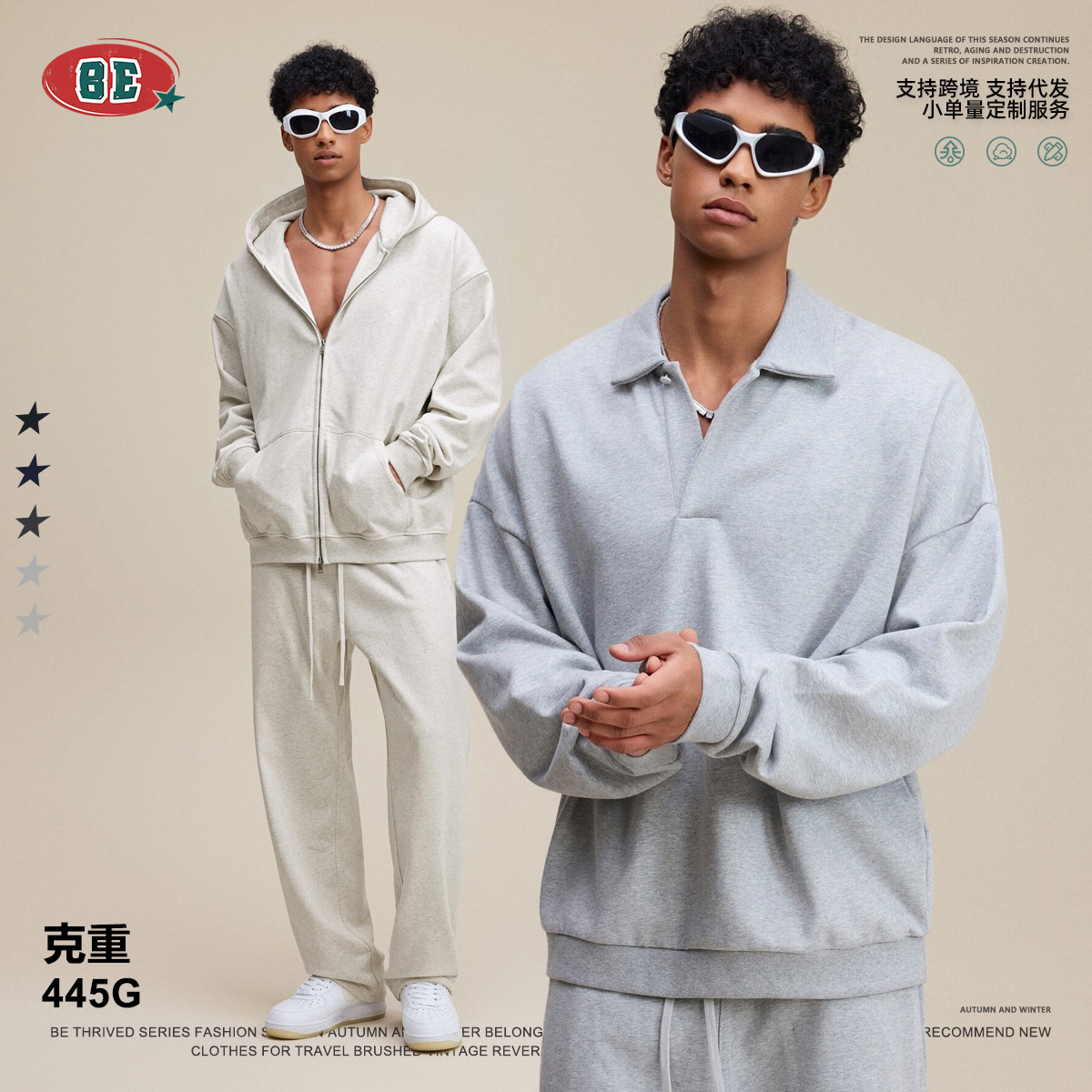 BE男装2025秋季美式宽松纯色加绒加厚拉链连帽卫衣休闲长裤套装男