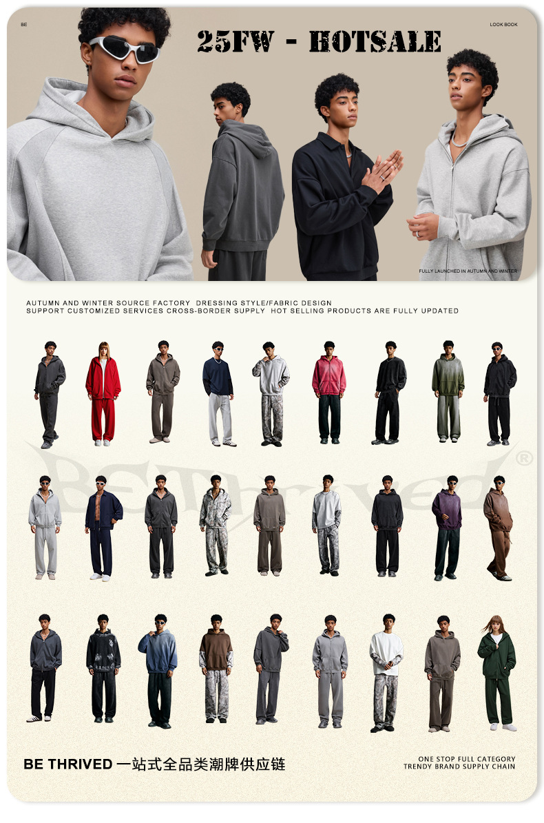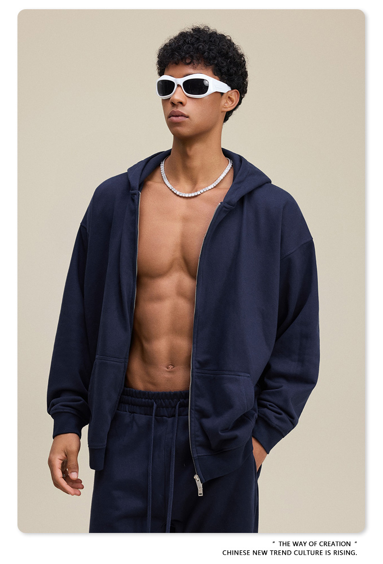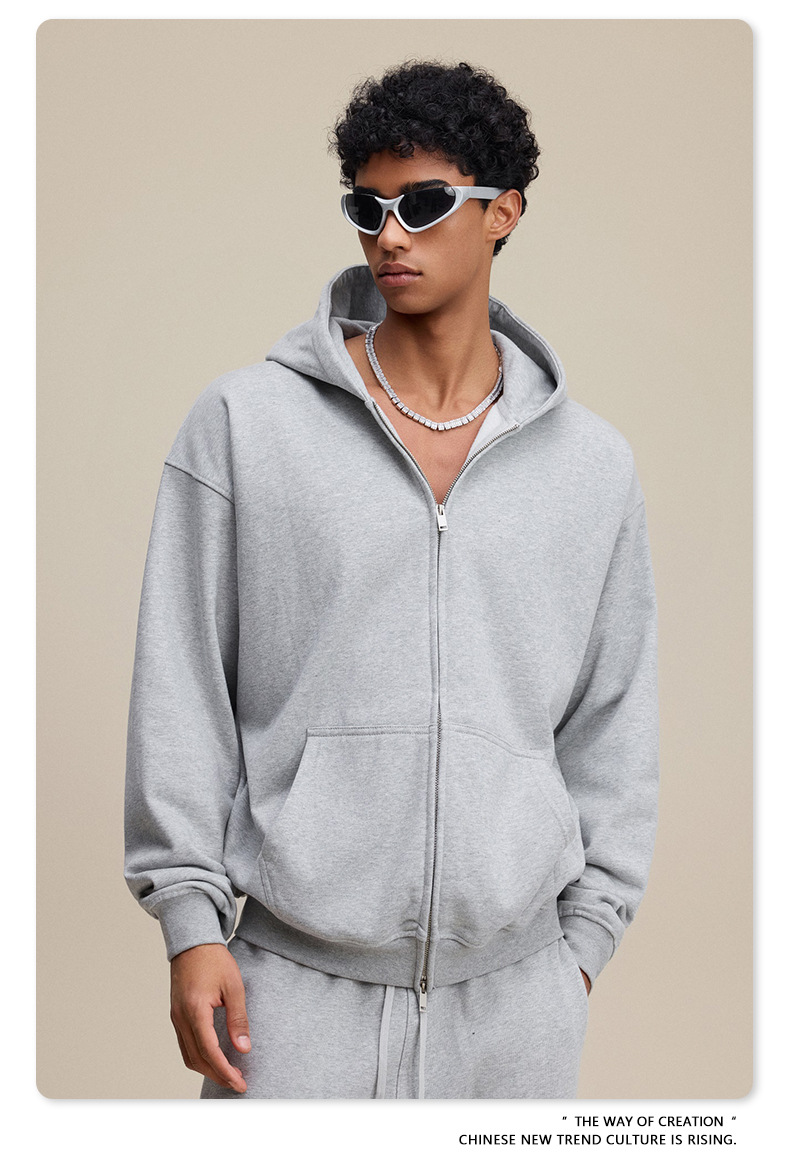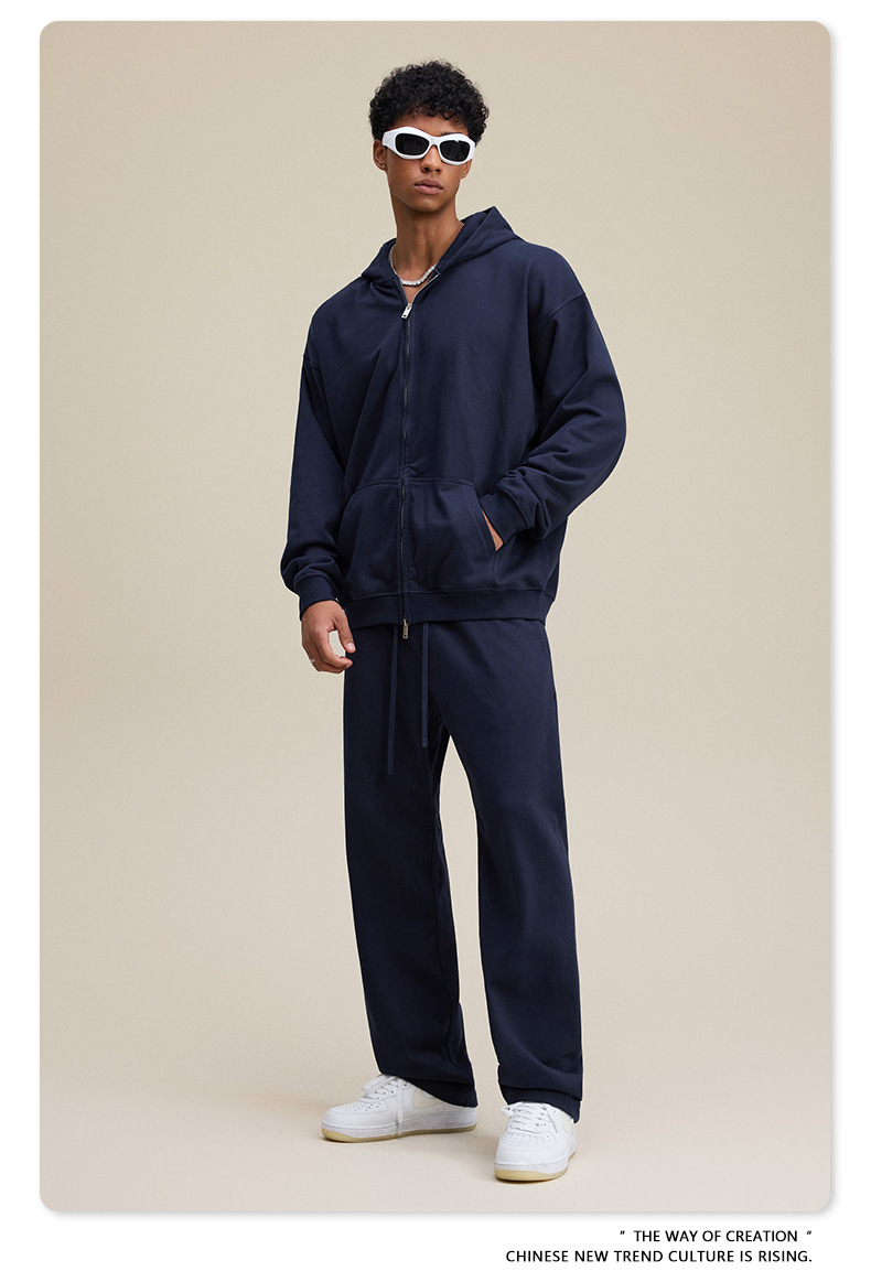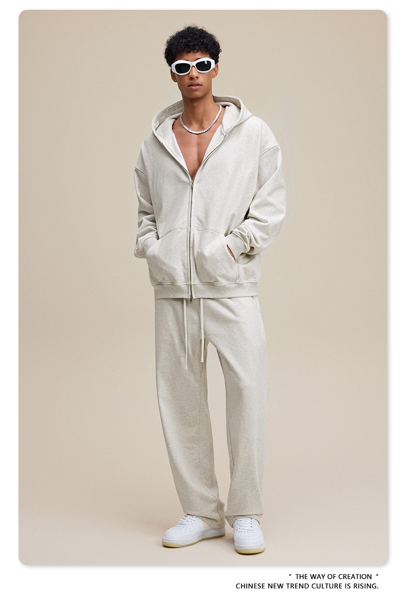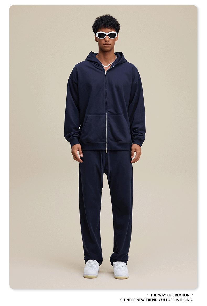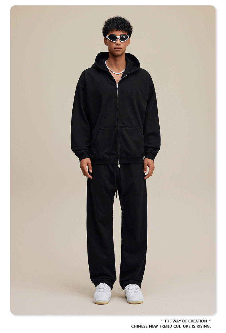 BE男装2025秋季美式宽松纯色加绒加厚拉链连帽卫衣休闲长裤套装男